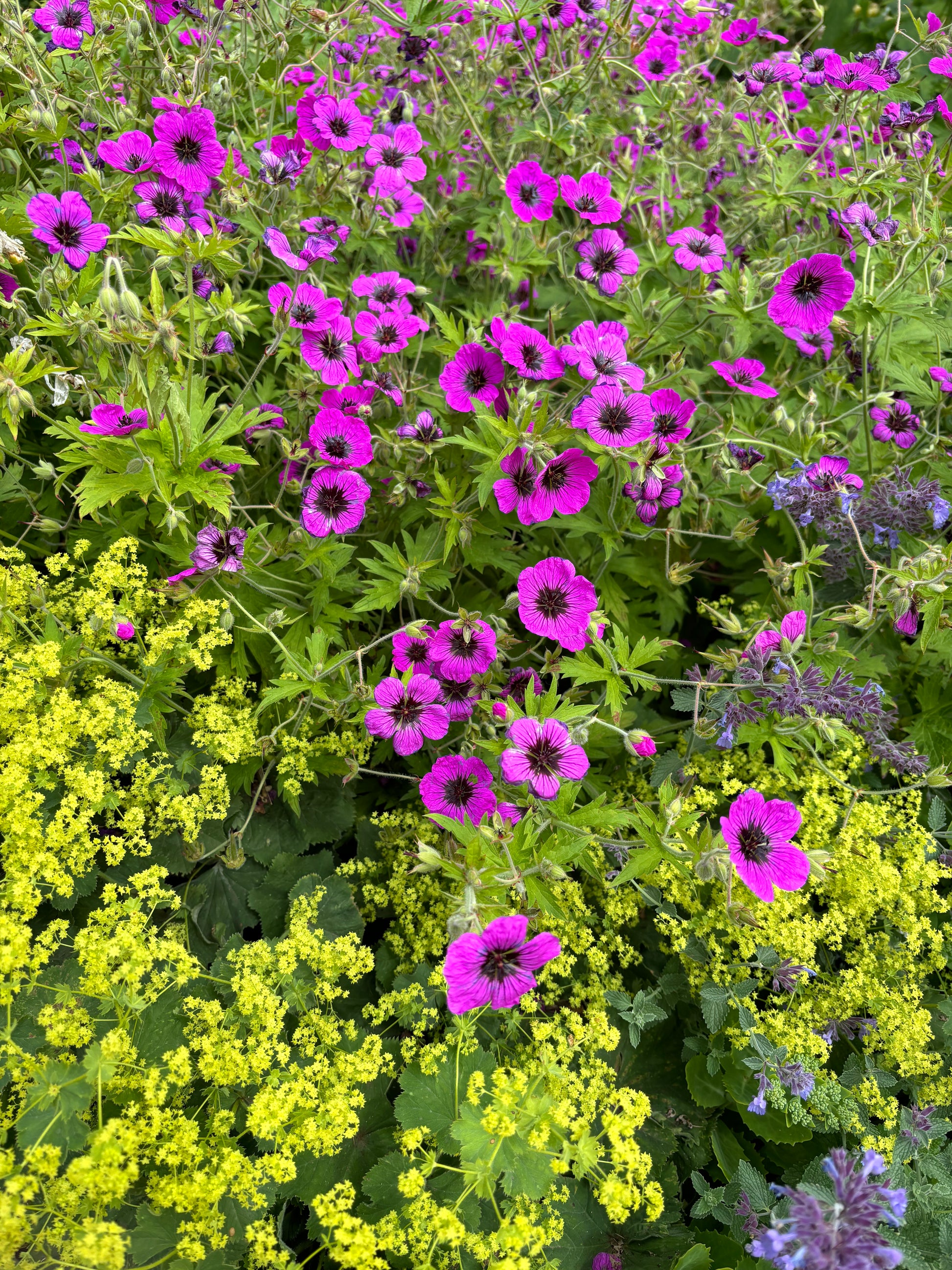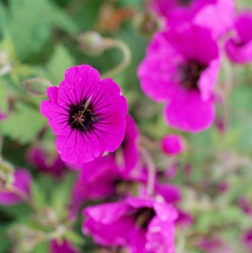 Ann Folkhard is a showstopper in any border. Lime green foliage combines with masses of magenta flowers with dark centres to make this a must have plant.One of the hardy geranium group this tough plant will withstand dry periods, and freezing temperatures with ease.Best planted in the middle of the border combined with yellow or blue flowering plants .