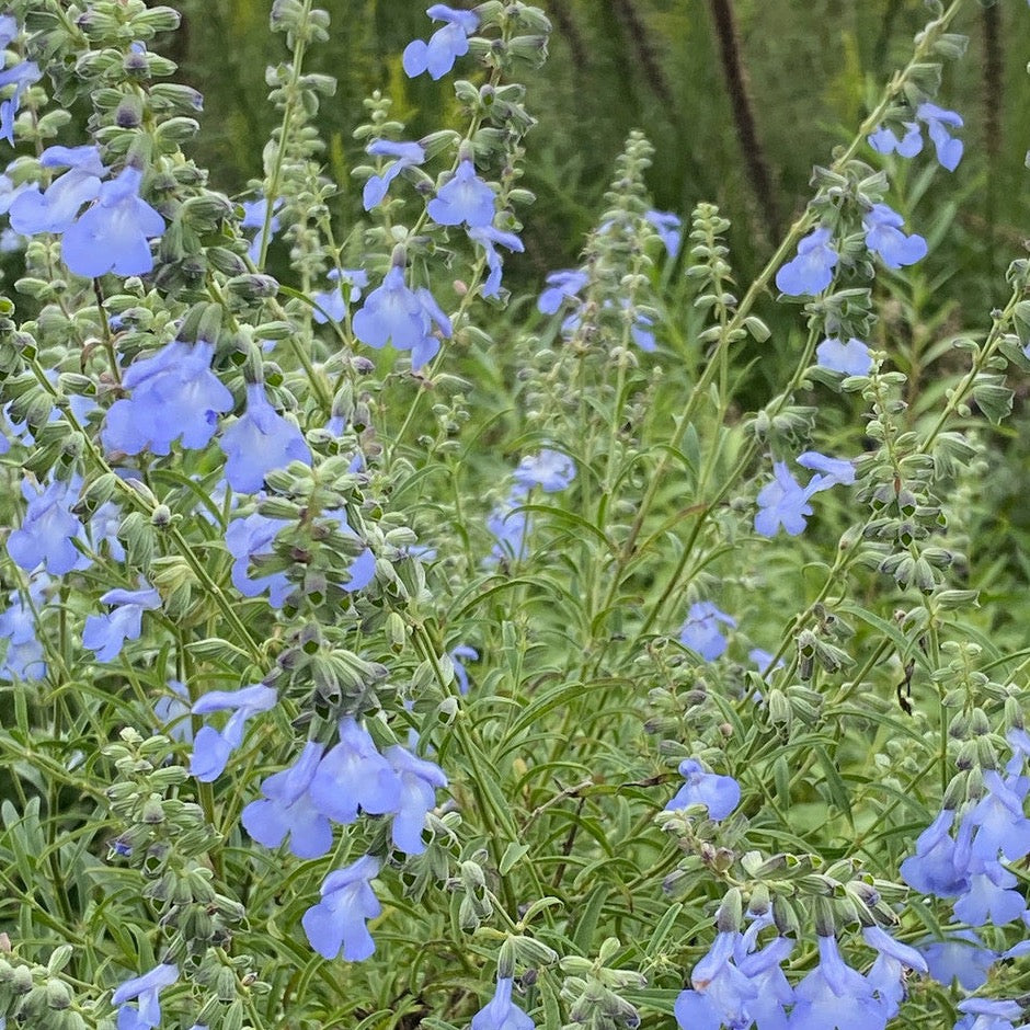 A medium sized ,lax growing shrubby salvia with soft dreamy blue flowers.Flowers are held on tall stems making this a delightful choice to line a pathway or to combine with flowers such as Gaura White Butterflies in the border.Full sun and well drained soil is ideal for best results.