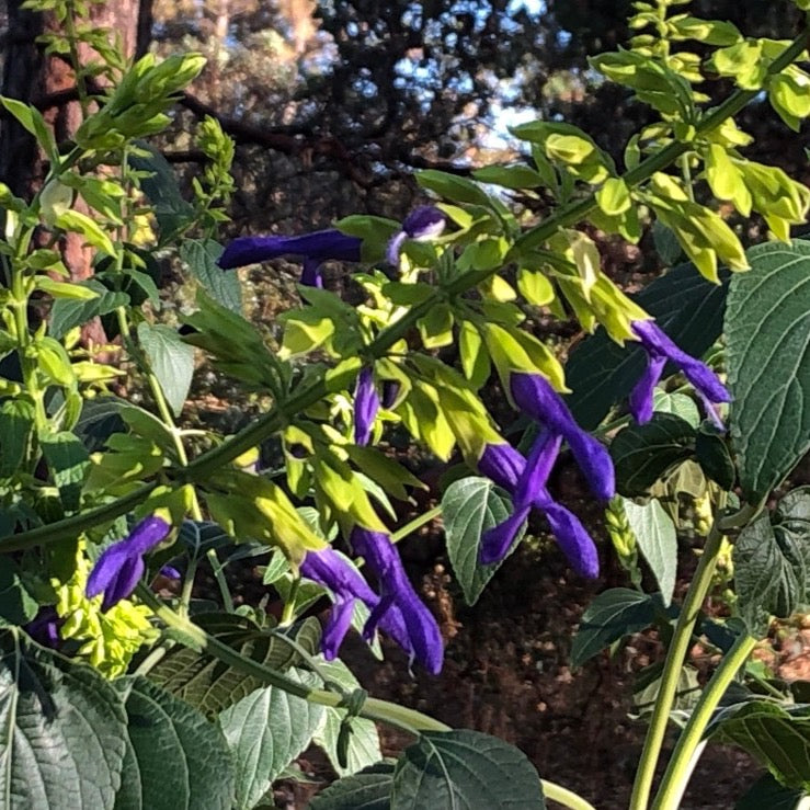 This large leafed salvia is useful for adding bulk towards the back of the border. Pale lime and purple flowers are produced reliably from summer until the first frosts arrive.A favourite with pollinating insects and birds.